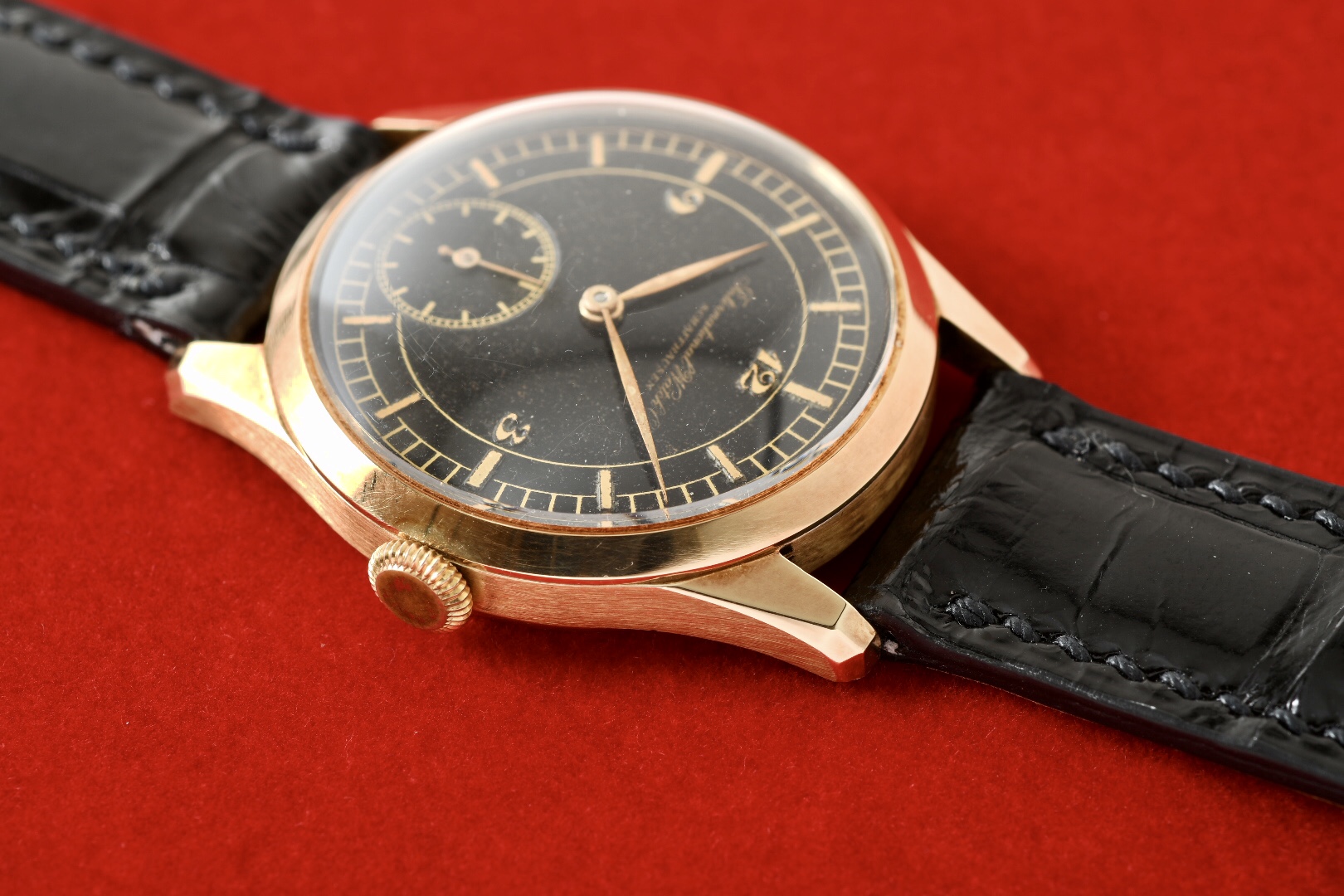 レアな金無垢83ブラックセクターダイヤル、アップライドブレゲインデックス。