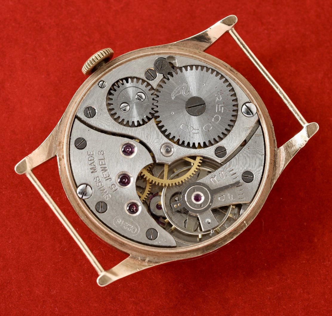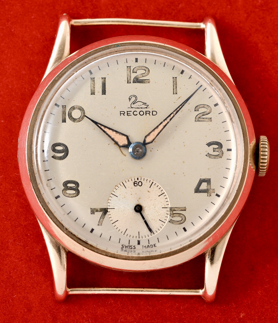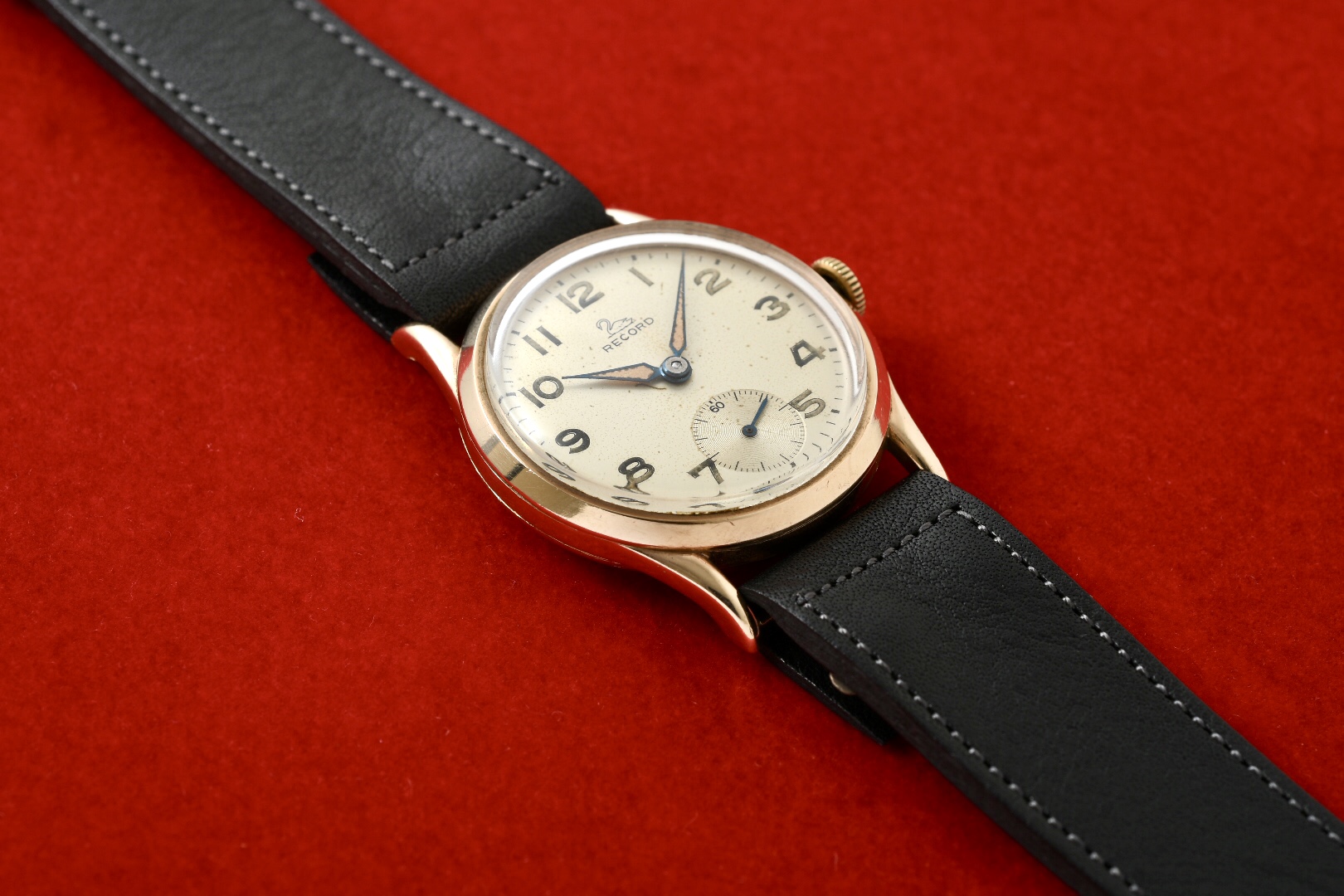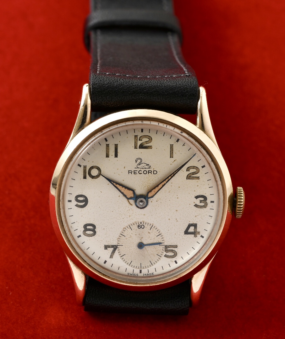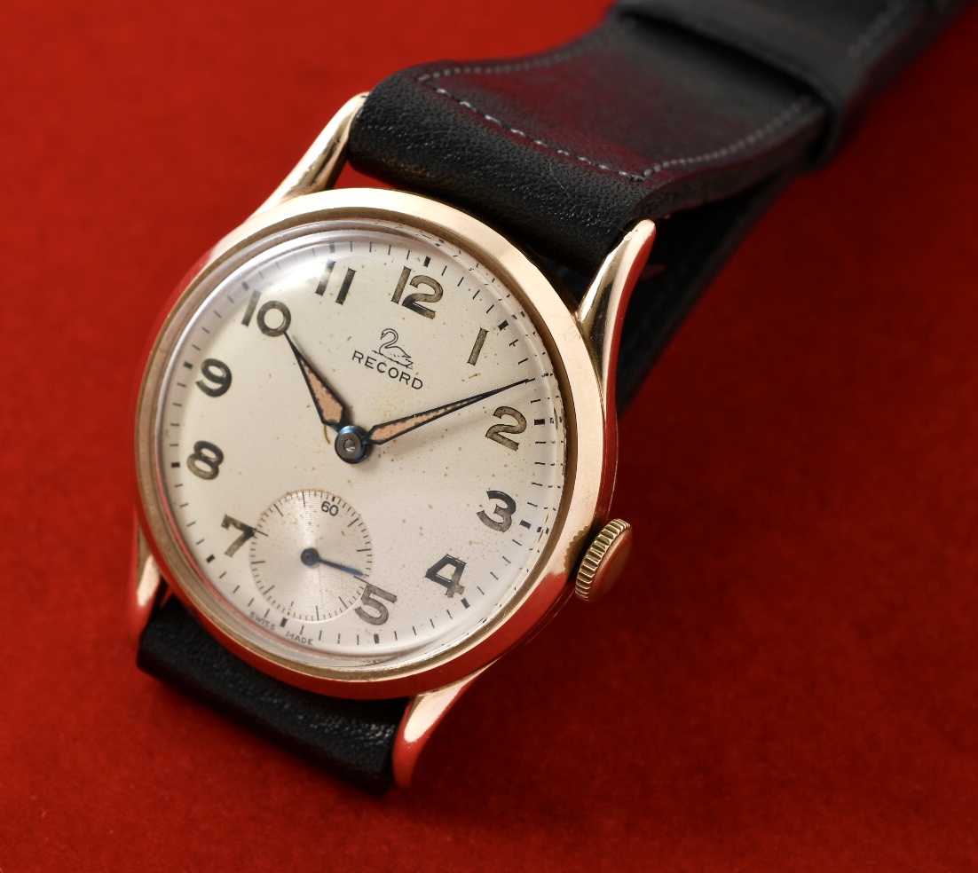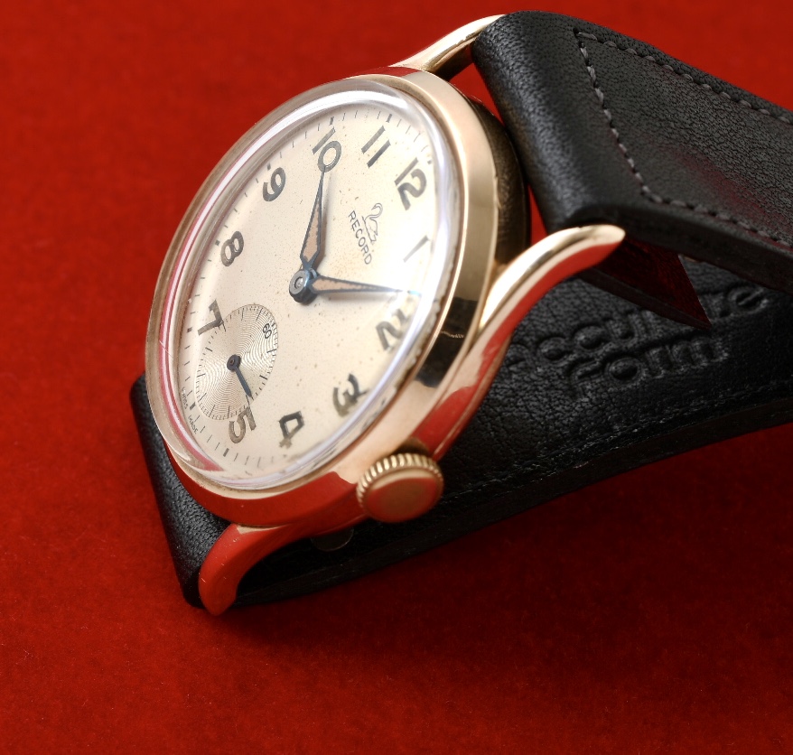 ラグ固定式金無垢ケースにダイヤルの愛らしい雰囲気を持つ40年代レコード製です。