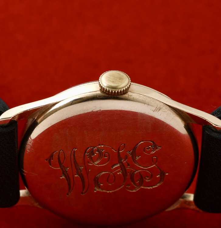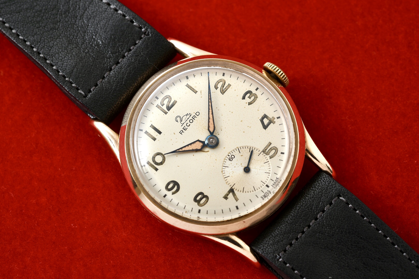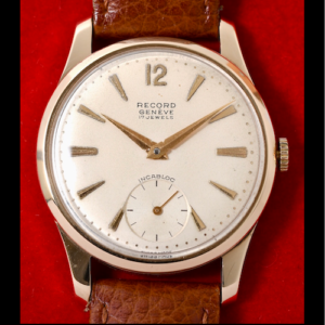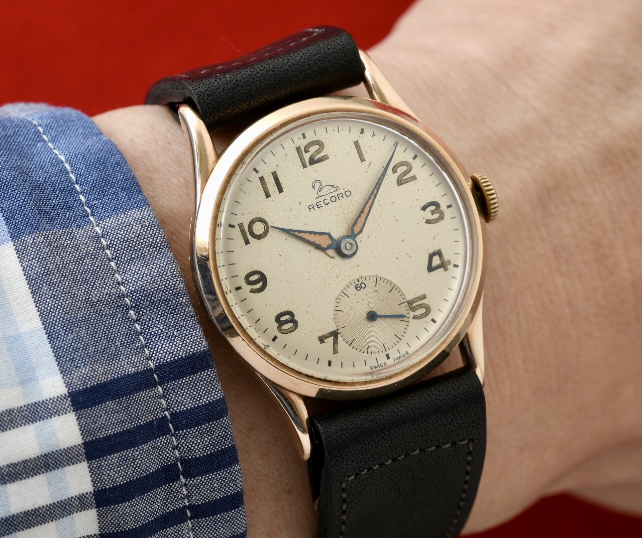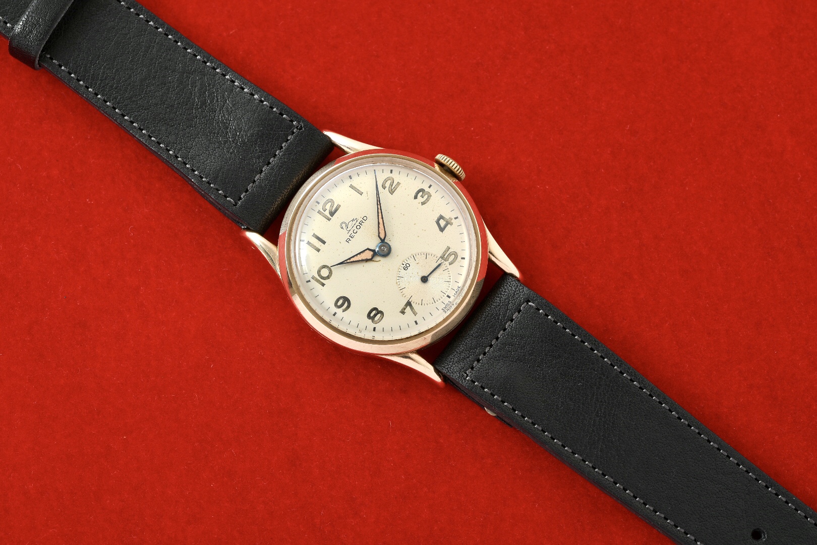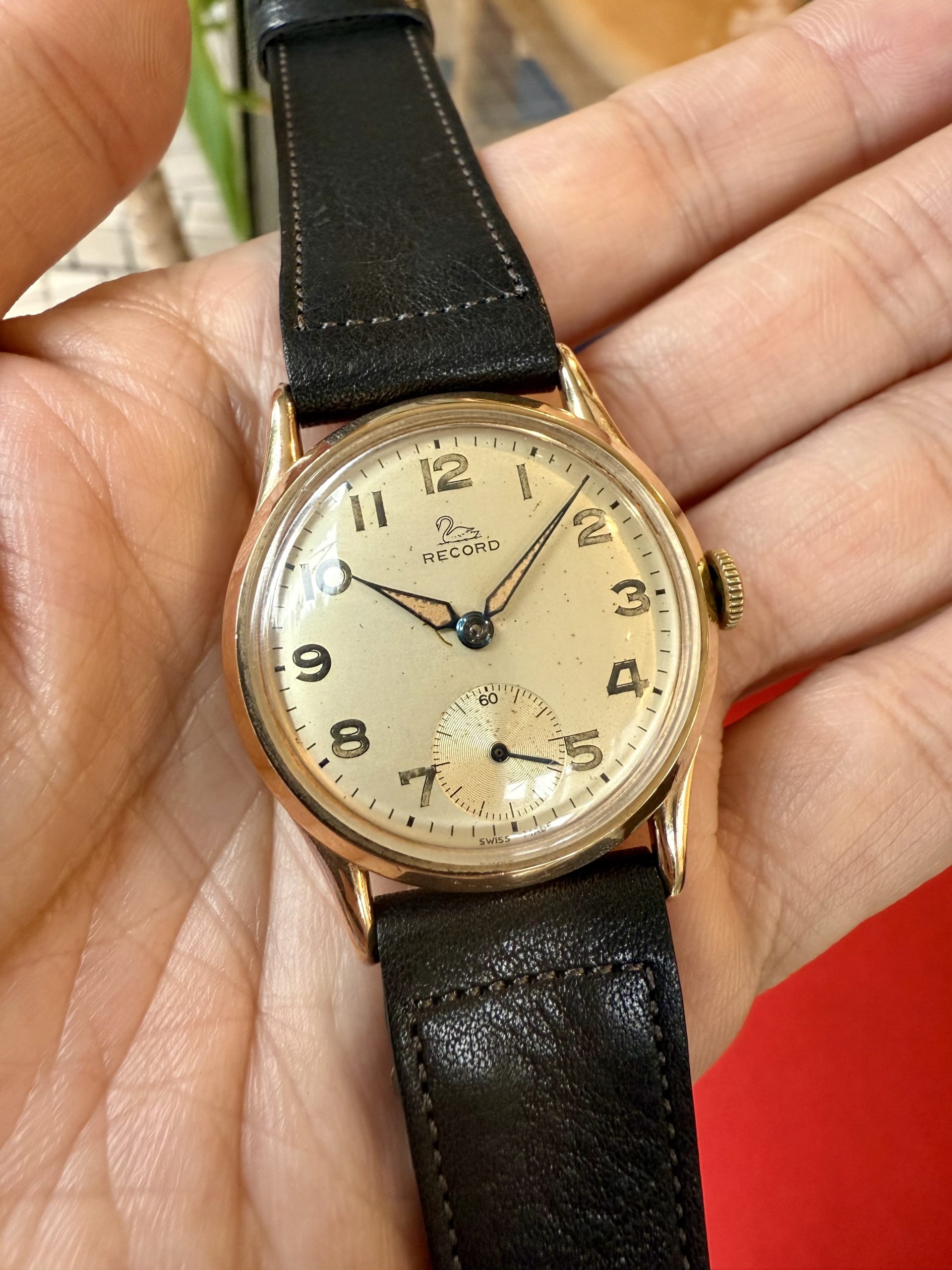ラグ固定式金無垢ケースにダイヤルの愛らしい雰囲気を持つ40年代レコード製です。
