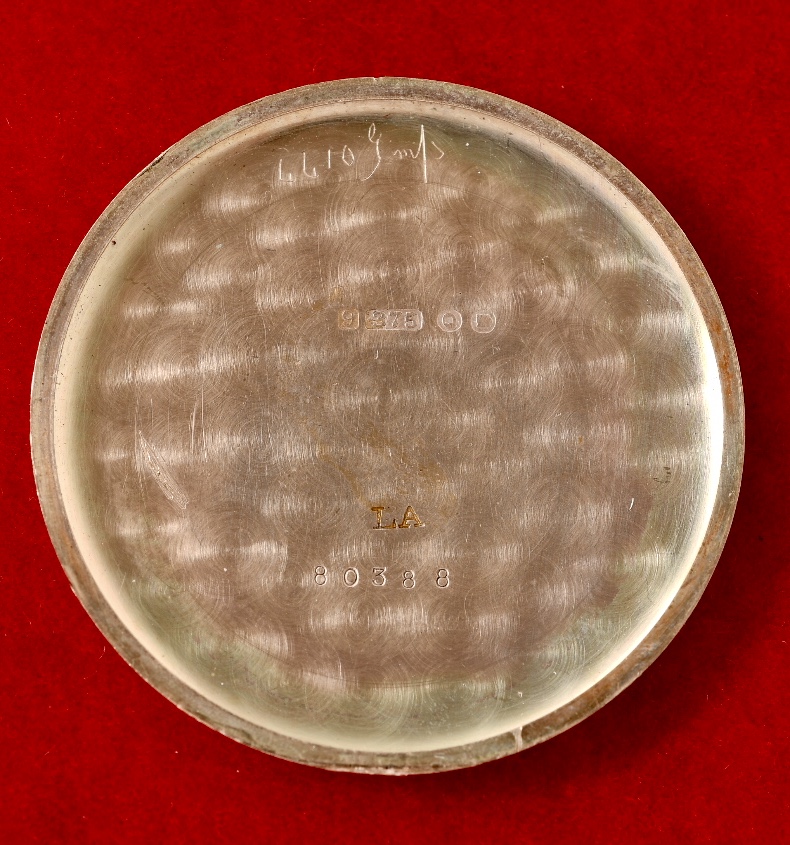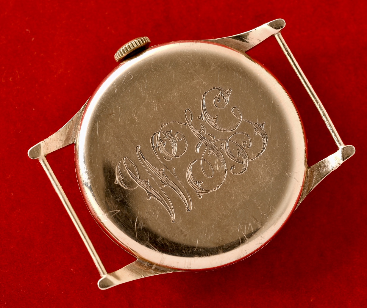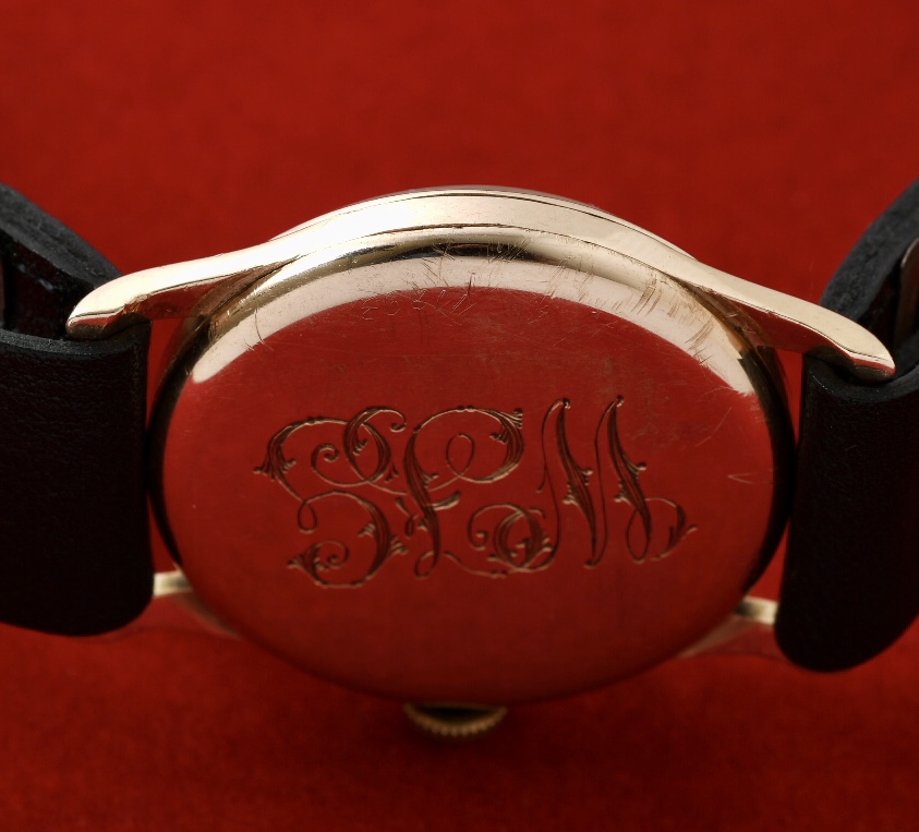 ケース裏蓋に凝った手彫りのエングレーピング入ります。裏蓋内側には金製品のホールマーク入ります。